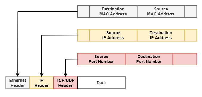MAC, IP, Port 주소가 포함된 헤더 위치는 위의 그림과 같습니다.
