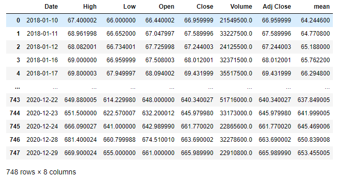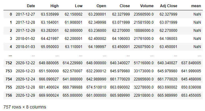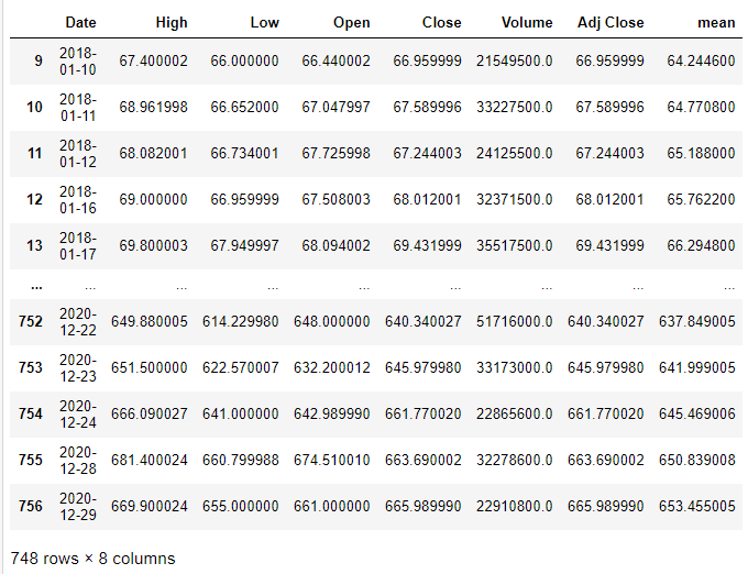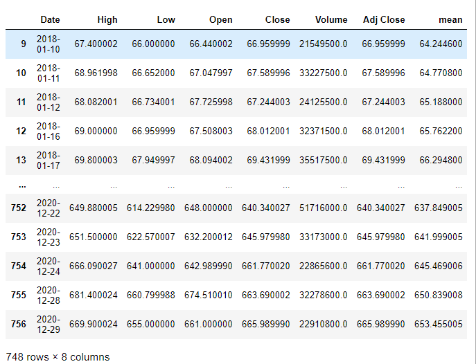 df['mean'] = df['Close'].rolling(window=10).mean()