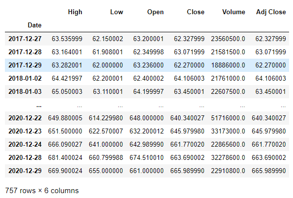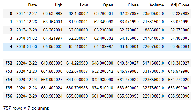 아래는 야후 파이낸셜에서 테슬라 주식의 일봉 데이터들을 읽어들이고 출력하는 코드다.
