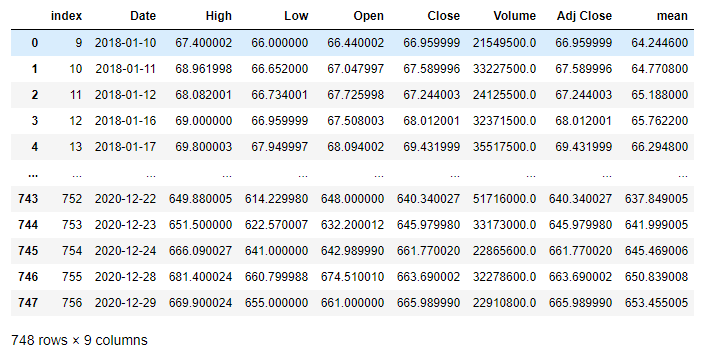 그리고 10개이전의 값들은 NaN으로 저장되어 있으므로, NaN 값이 포함된 데이터들의 행을 삭제한다.