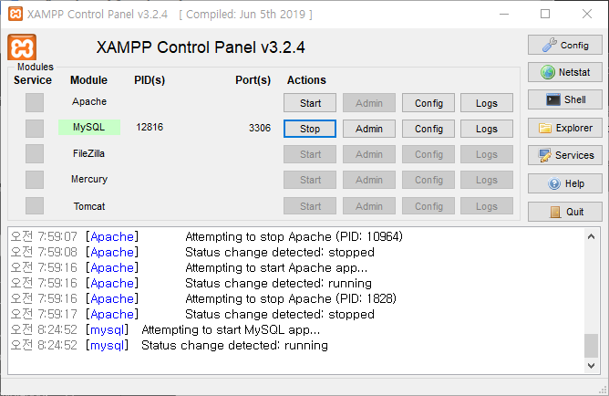 MySQL에 접근하기 전에 해야 할 일이 있습니다. XAMPP 프로그램을 실행시켜, MySQL을 Start하는 것입니다.