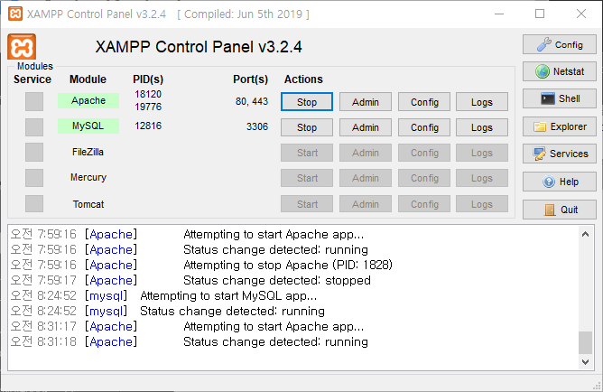 * XAMPP 설치 시, Apache와 MySQL은 설치목록에 포함하세요.