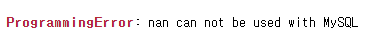python을 이용하여 MySQL에 데이터를 삽입할 때, ProgrammingError: nan can not be used with MySQL 에러 문구를 발결할 수도 있습니다. 원인은 MySQL에서 python의 nan을 받아들이기 어렵기 때문입니다. 해결법은 다음 코드와 같이 간단합니다.