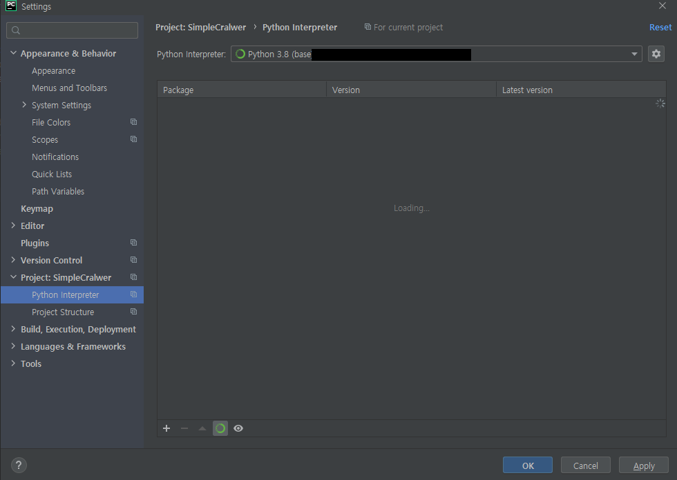 혹은 Ctrl + Alt + S를 누르셔도 됩니다. 이후에 Project: 프로젝트명 -> Python interpreter를 클릭하면, 다음과 같은 화면 나옵니다.