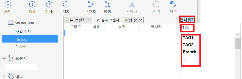 Sourcetree에서 Git Commit 번호, Tag, Branch 등을 검색할 수 있습니다.